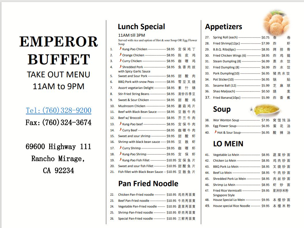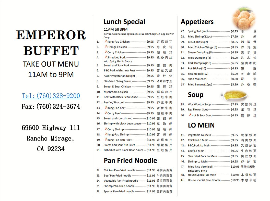 Welcome to Emperor Buffet, a culinary haven located at 69600 CA-111, Rancho Mirage, CA. This buffet restaurant offers an impressive dining experience, serving delicious cuisines at unbeatable prices. With weekday lunch at just $16.99 and dinner options starting from $25.99, it’s an ideal choice for families and friends alike. The all-day weekend buffet at $27.99 is a highlight, featuring a vast array of delectable dishes.